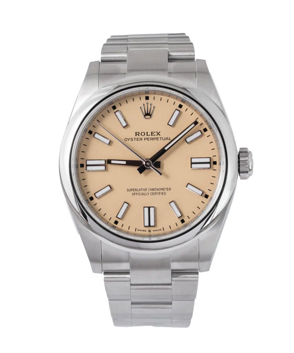 This Rolex Oyster Perpetual 134300 has a Yellow dial and a Bracelet strap.