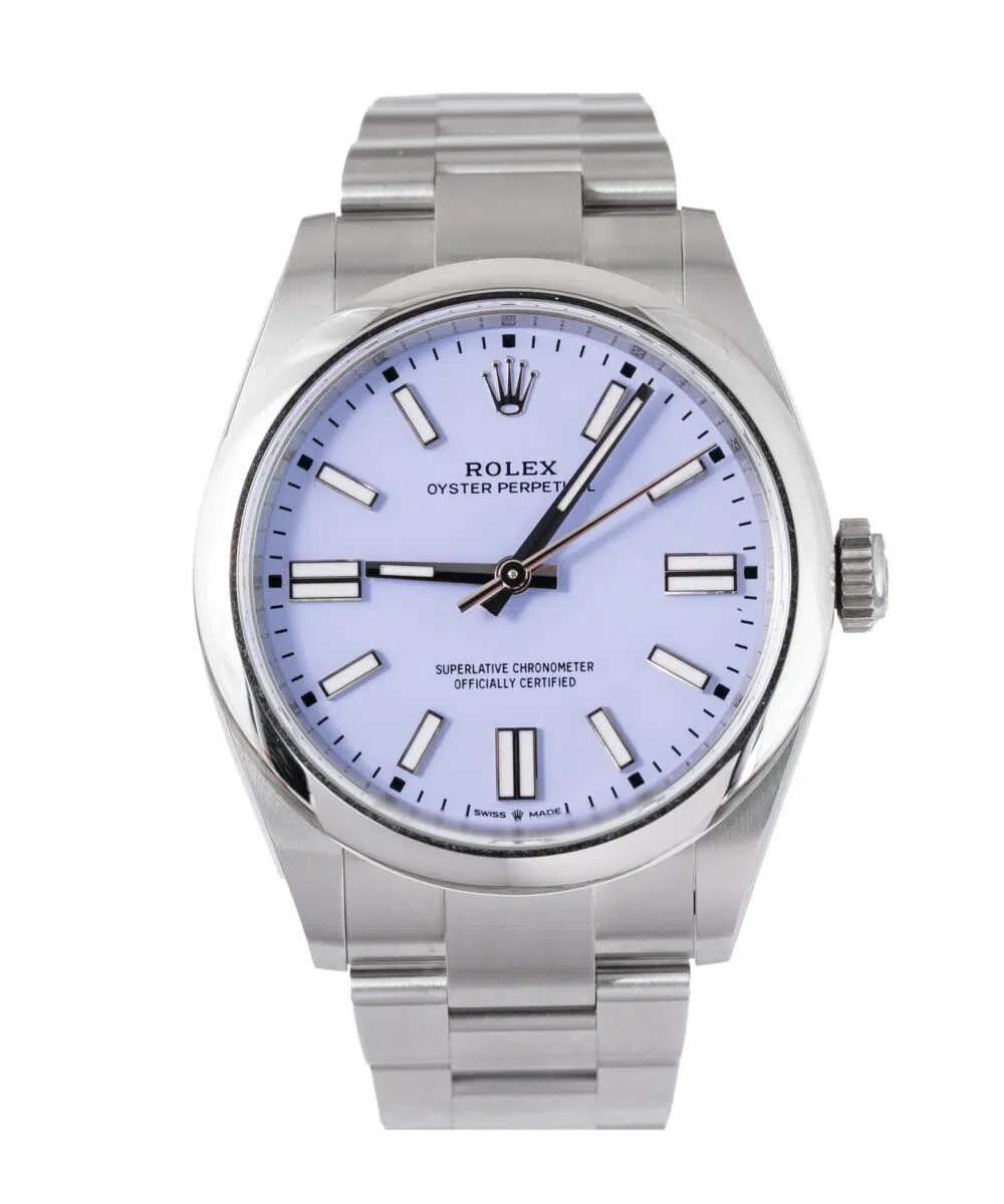 This Rolex Oyster Perpetual 134300 has a Purple dial and a Bracelet strap.