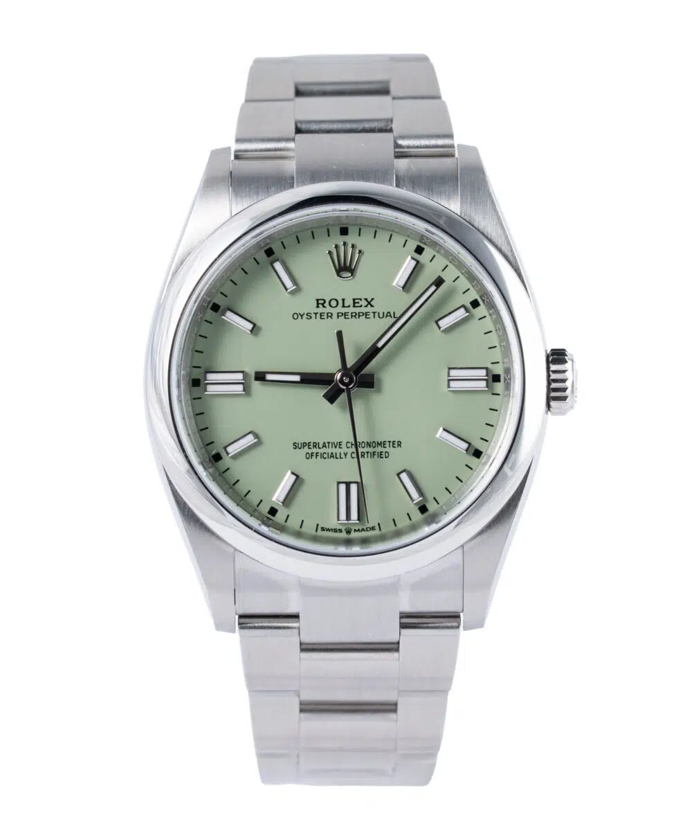 This Rolex Oyster Perpetual 126000 has a Pistachio dial and a Oyster strap.