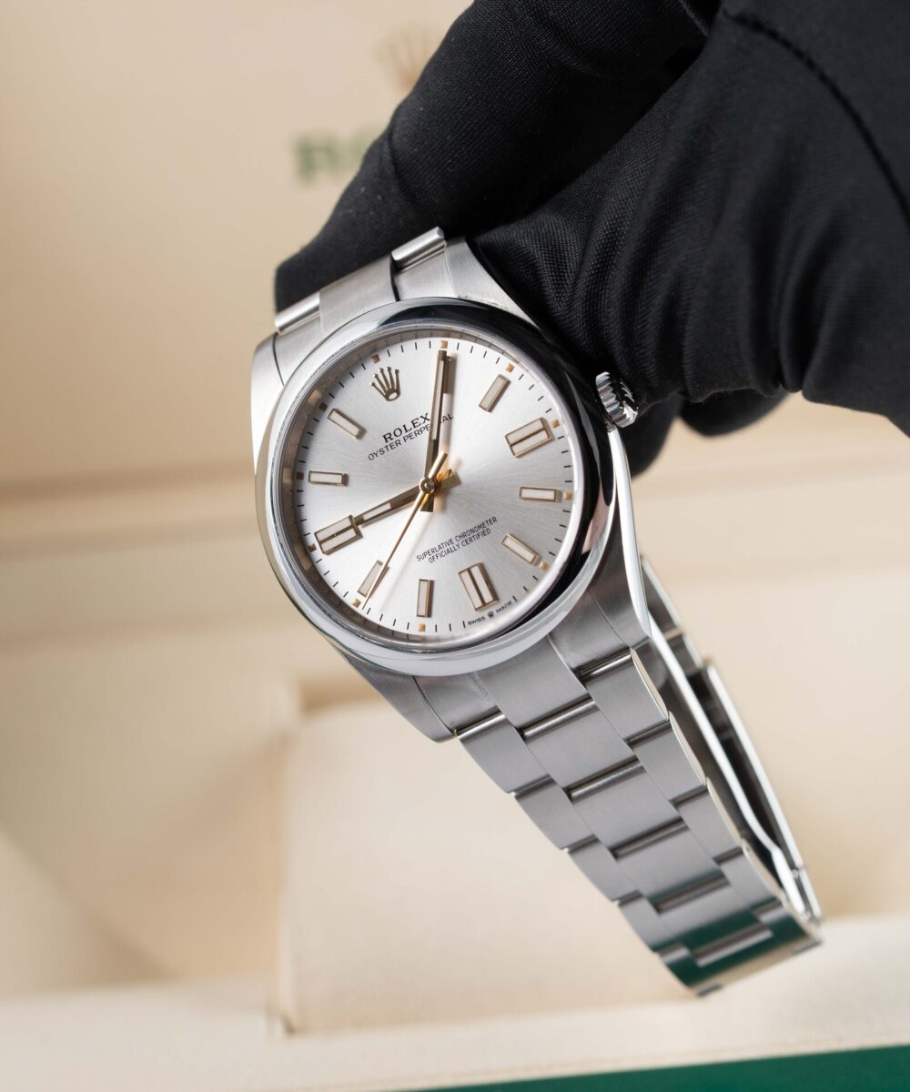 This Rolex Oyster Perpetual 41 124300 has a Grey dial and a Oyster strap.