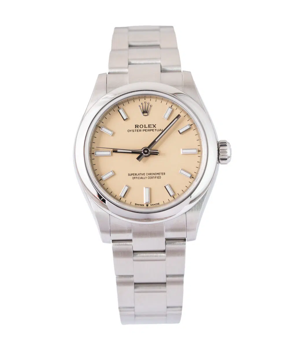 This Rolex Oyster Perpetual 277200 has a Beige dial and a Bracelet strap.