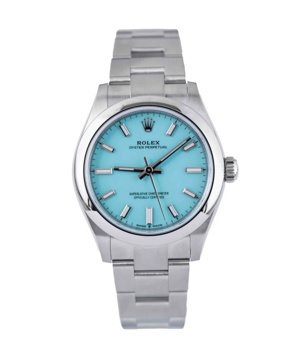 This Rolex Oyster Perpetual 277200 has a Blue dial and a Bracelet strap.