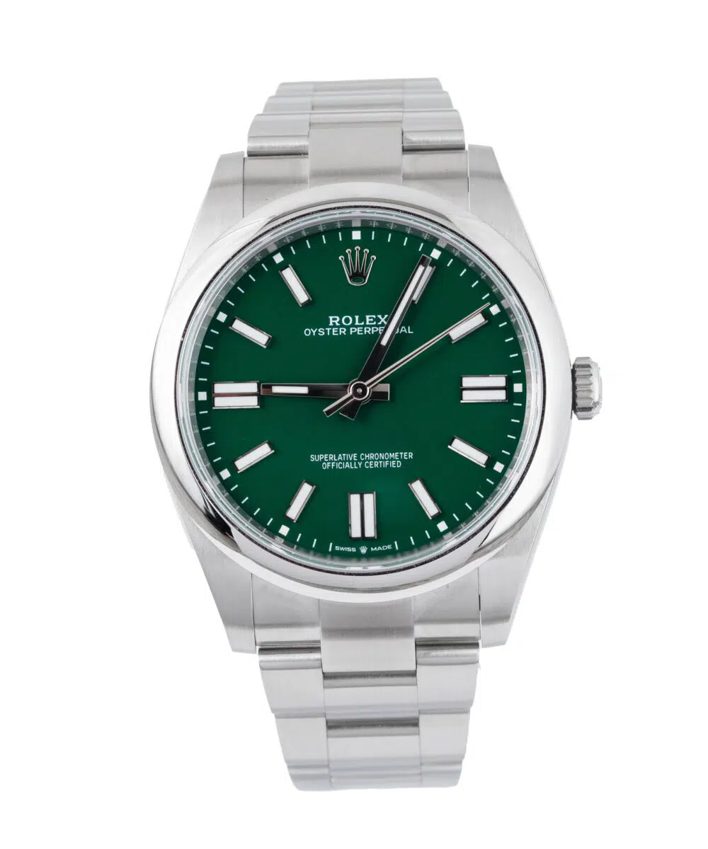 This Rolex Oyster Perpetual 124300 has a Green dial and a Bracelet strap.