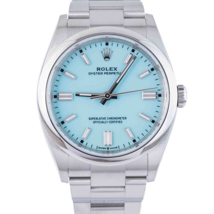 This Rolex Oyster Perpetual 126000 has a Blue dial and a Bracelet strap.