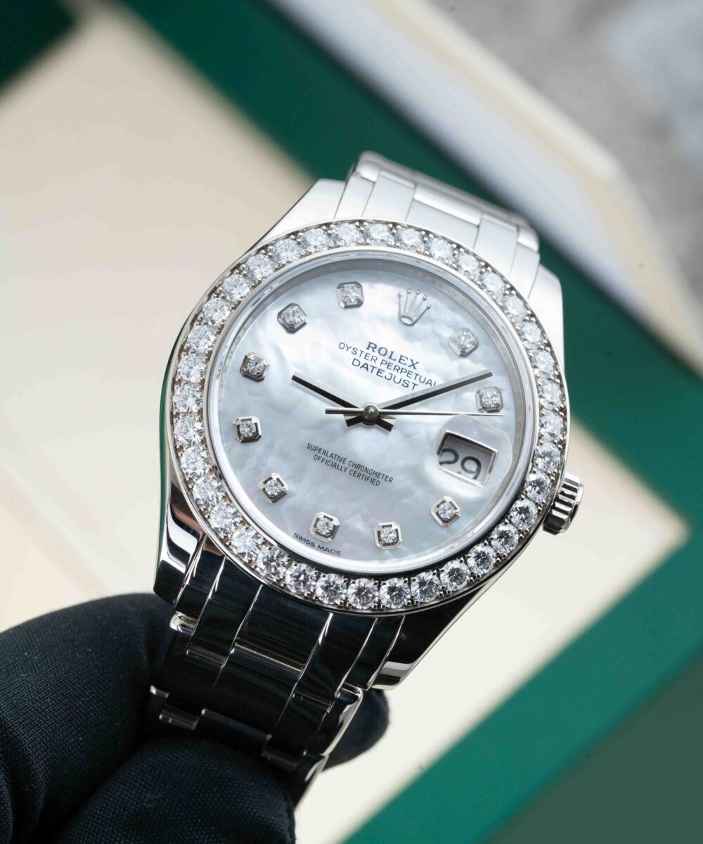This Rolex Pearlmaster 86289 has a Mother Of Pearl dial and a Bracelet strap.