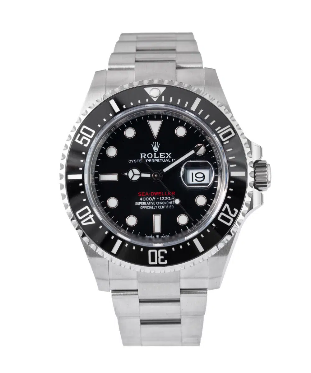 This Rolex Sea-Dweller 126600 has a Black dial and a Bracelet strap.