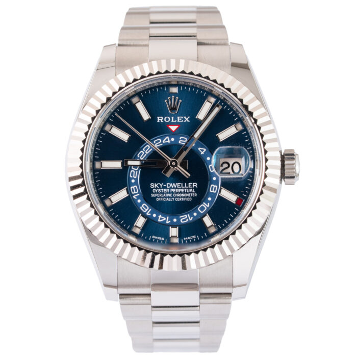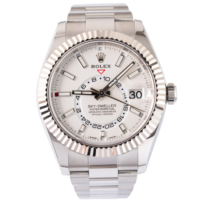 This Rolex Sky-Dweller 326933 has a White dial and a Bracelet strap.