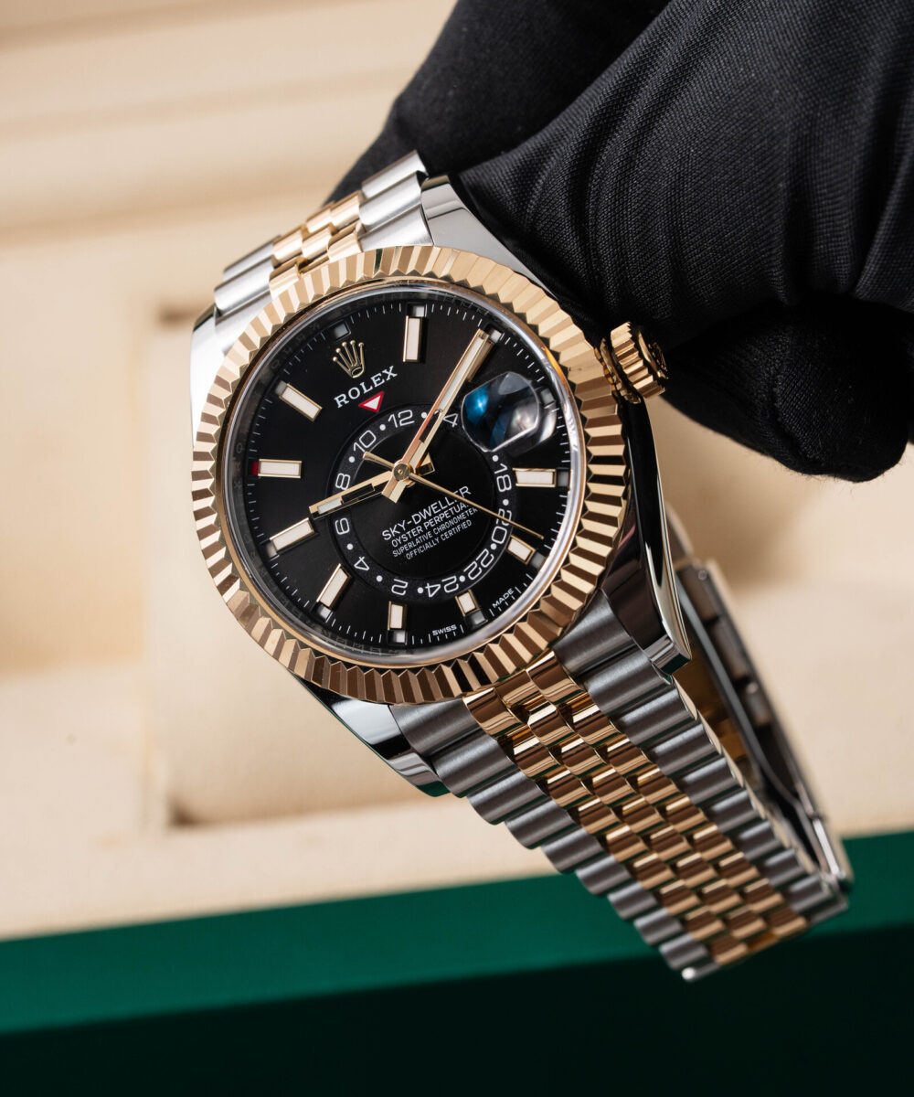 This Rolex Sky-Dweller 326933 has a Black dial and a Bracelet strap.