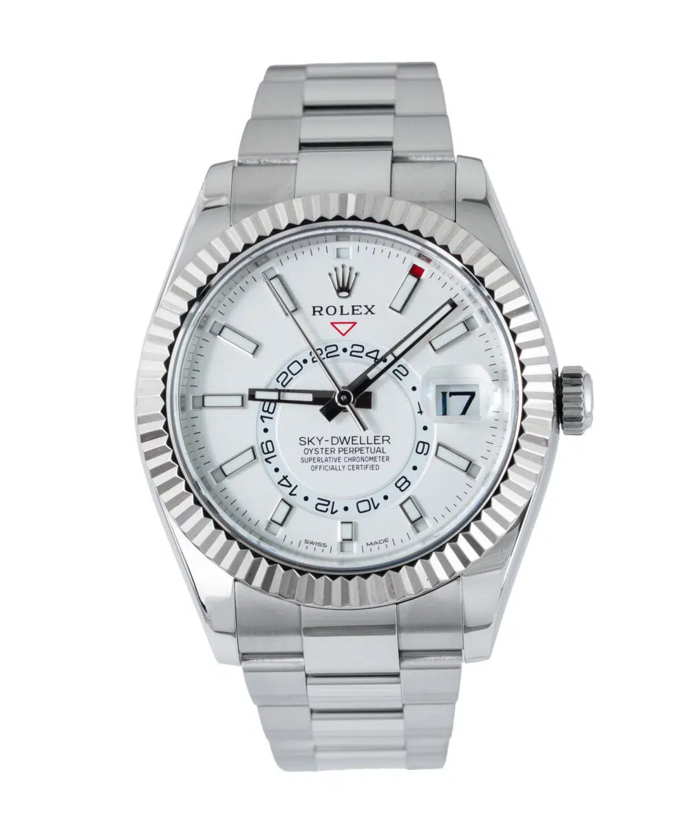 This Rolex Sky-Dweller 326934 has a White dial and a Bracelet strap.