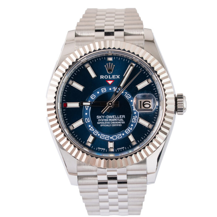 This Rolex Sky-Dweller 326934 has a Black dial and a Bracelet strap.