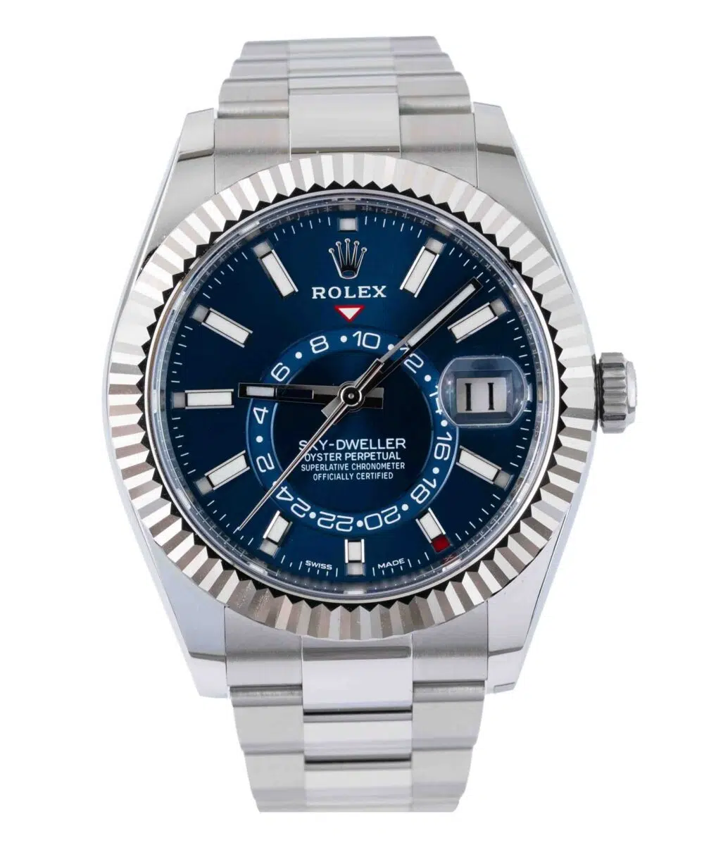 This Rolex Sky-Dweller 326934 has a Blue dial and a Bracelet strap.