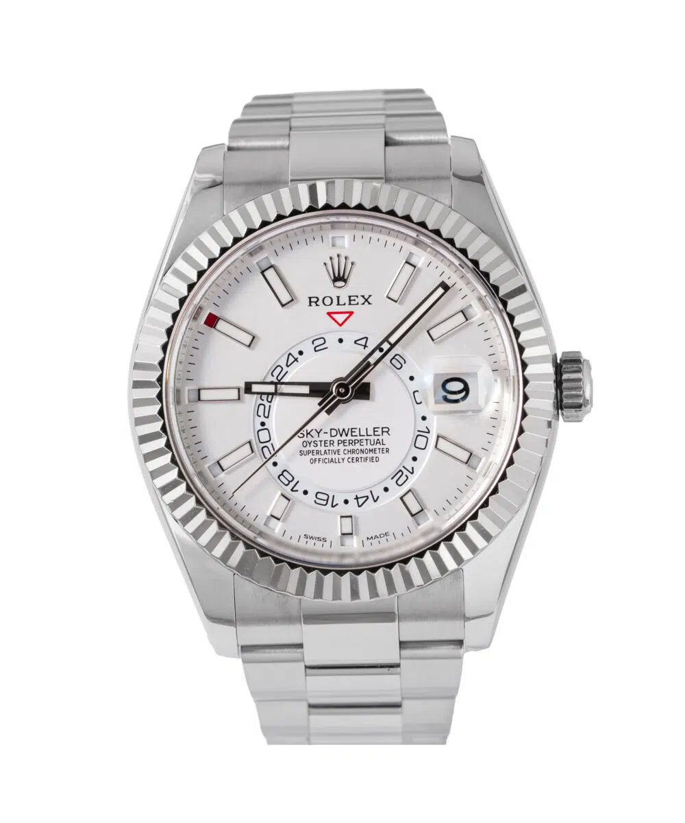 This Rolex Sky-Dweller 326934 has a White dial and a Bracelet strap.