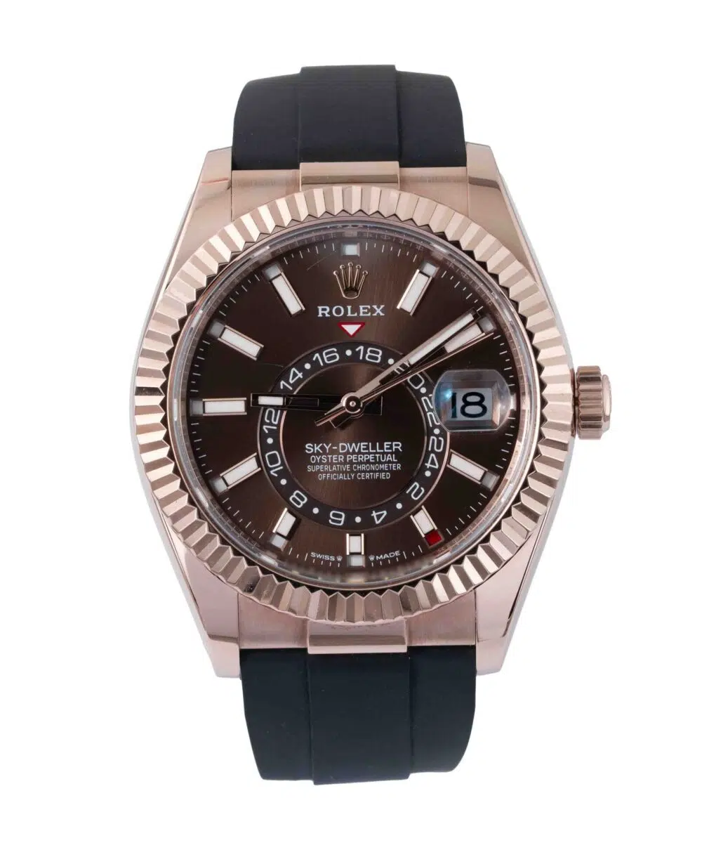 This Rolex Sky-Dweller 336235 has a Brown dial and a Rubber strap.