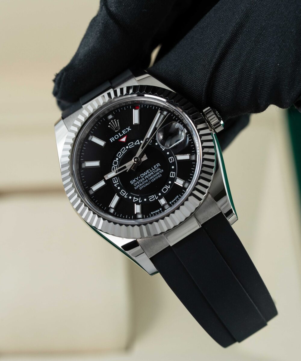 This Rolex Sky-Dweller 336239 has a Black dial and a Rubber strap.