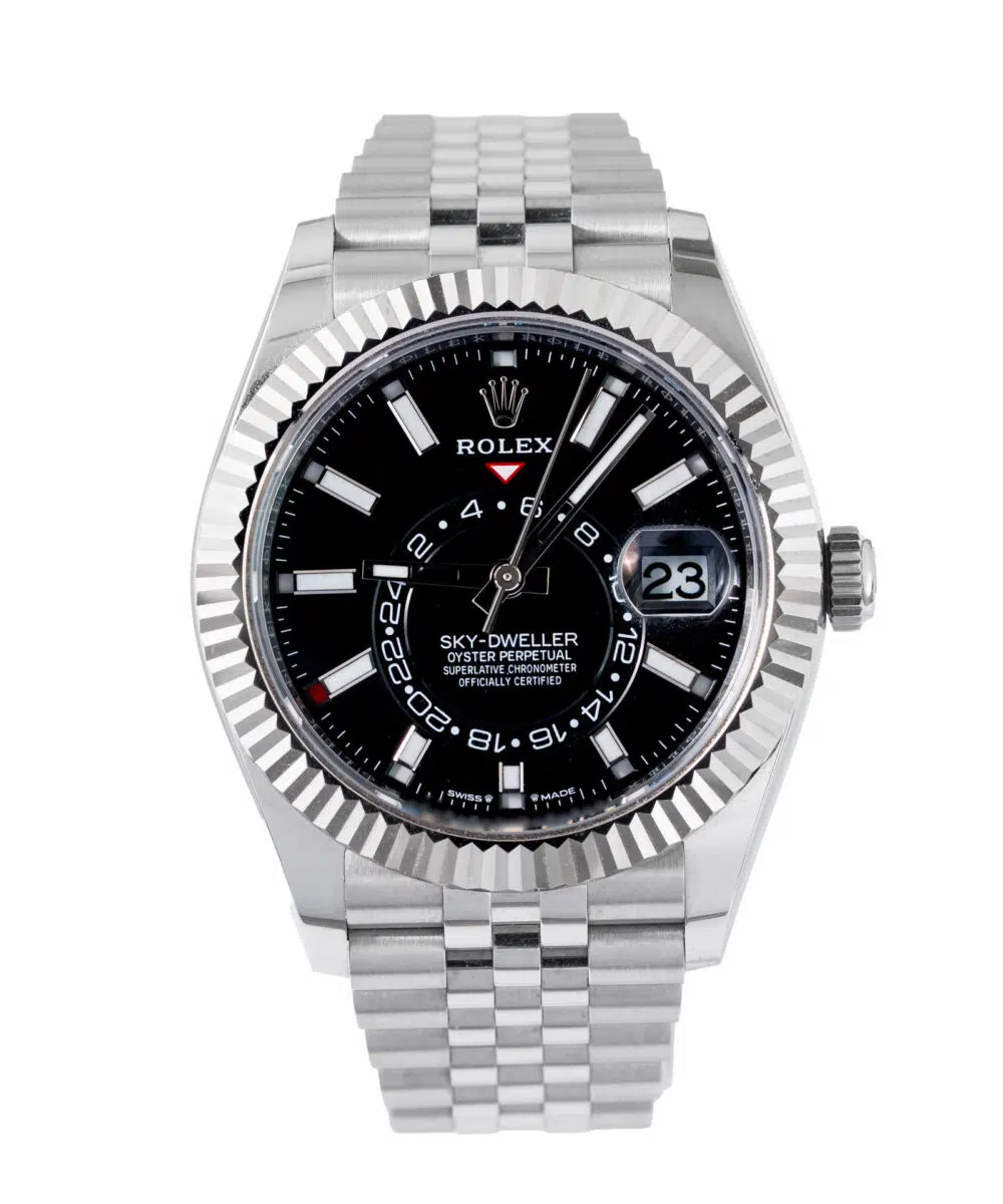This Rolex Sky-Dweller 336934 has a Black dial and a Bracelet strap.