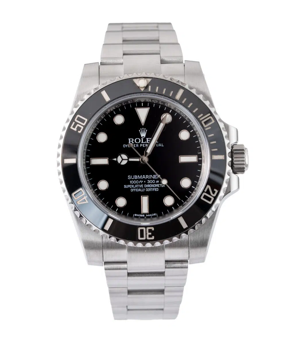 This Rolex Submariner 114060 has a Black dial and a strap.