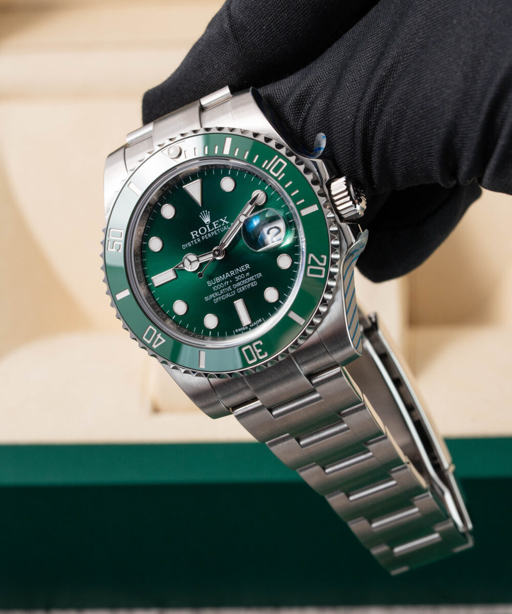 This Rolex Submariner 116610LV has a Green dial and a Bracelet strap.