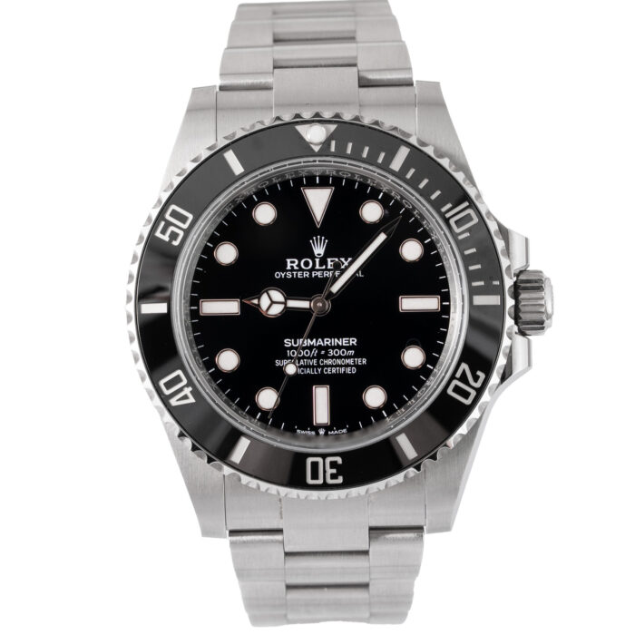 This Rolex Submariner 124060 has a Black dial and a Bracelet strap.
