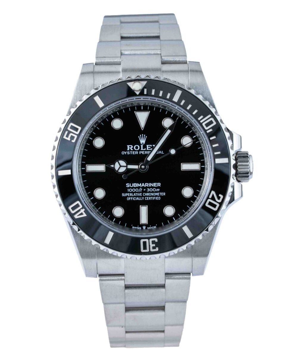This Rolex Submariner 124060 has a Black dial and a Bracelet strap.