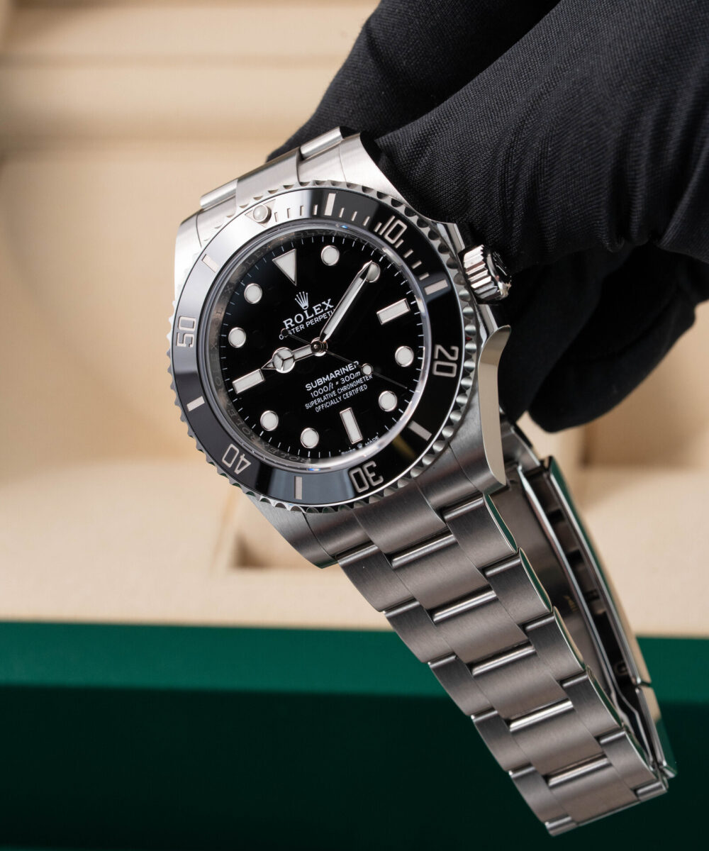 This Rolex Submariner 124060 has a Black dial and a Bracelet strap.