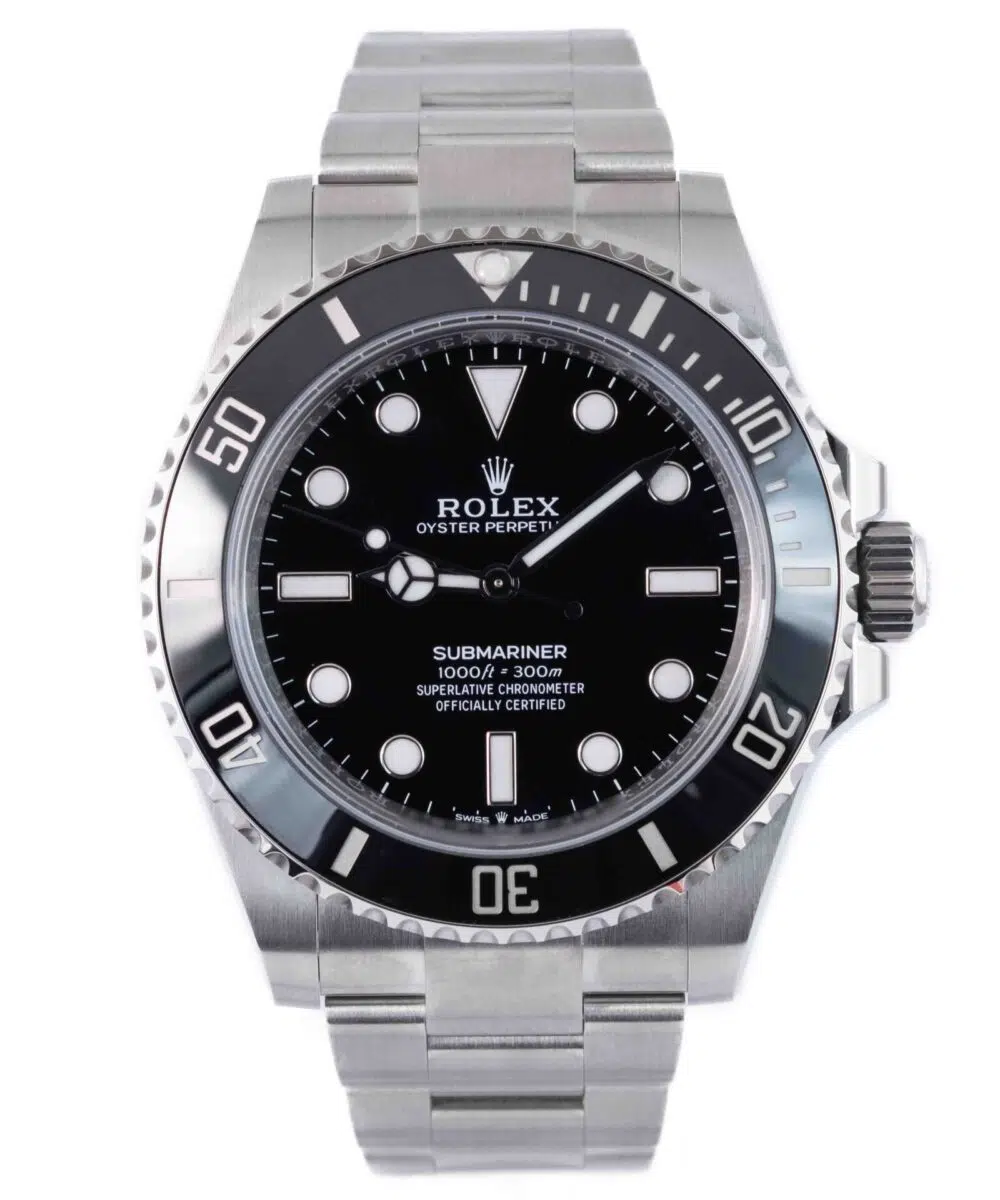 This Rolex Submariner 124060 has a Black dial and a Bracelet strap.