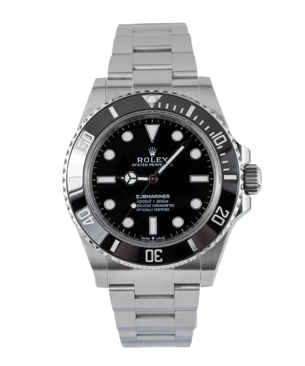 This Rolex Submariner 124060 has a Black dial and a Bracelet strap.