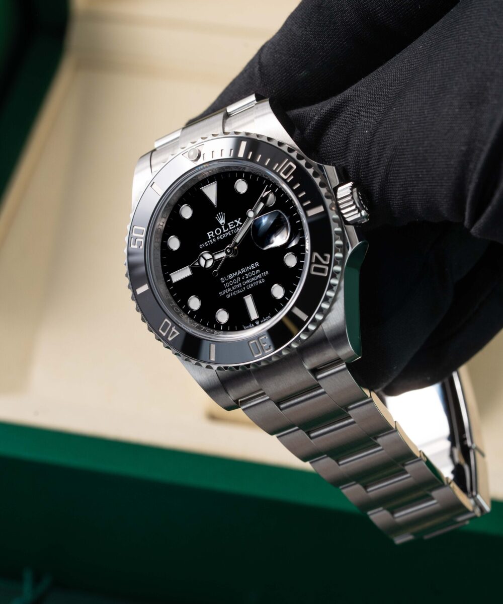 This Rolex Submariner 126610LN has a Black dial and a Bracelet strap.