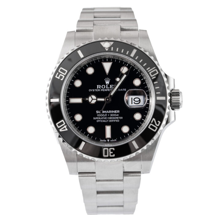 This Rolex Submariner 126610LV has a Black dial and a Bracelet strap.