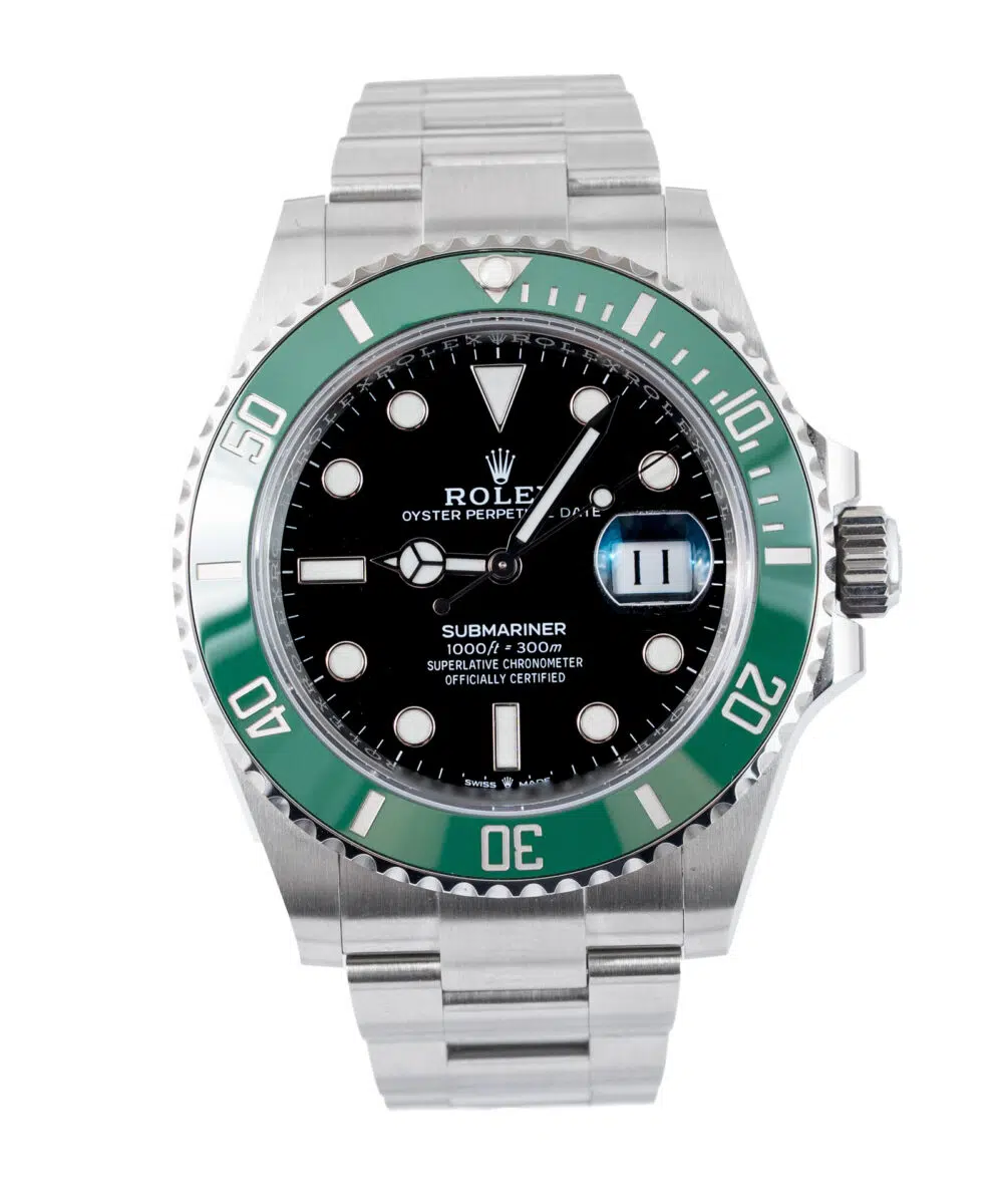 This Rolex Submariner 126610LV has a Black dial and a Bracelet strap.