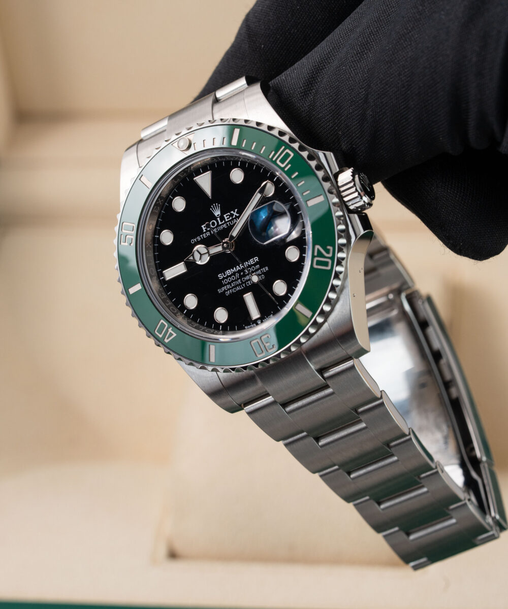This Rolex Submariner 126610LV has a Black dial and a Bracelet strap.