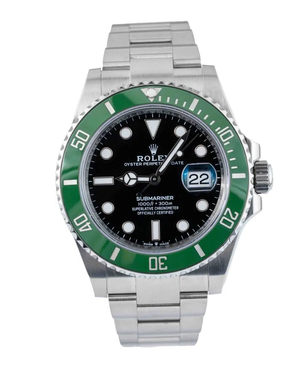This Rolex Submariner 126610LV has a Black dial and a Bracelet strap.
