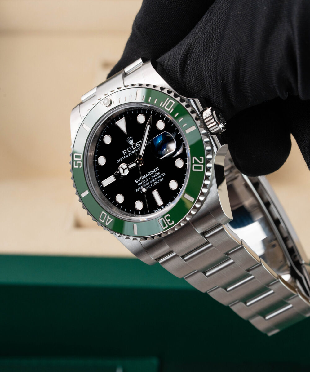 This Rolex Submariner 126610LV has a Black dial and a Bracelet strap.