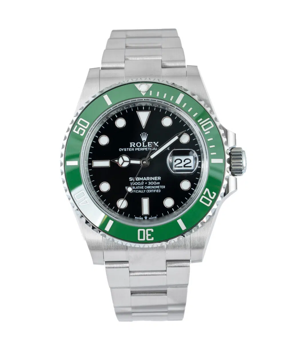 This Rolex Submariner 126610LV has a Black dial and a Bracelet strap.