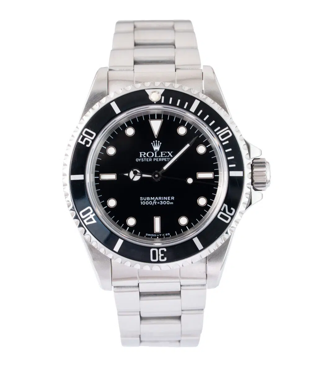 This Rolex Submariner 14060 has a Black dial and a Bracelet strap.
