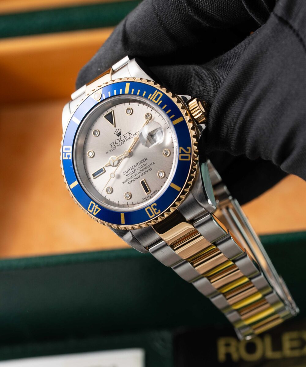 This Rolex Submariner 16613 has a Silver dial and a Bracelet strap.