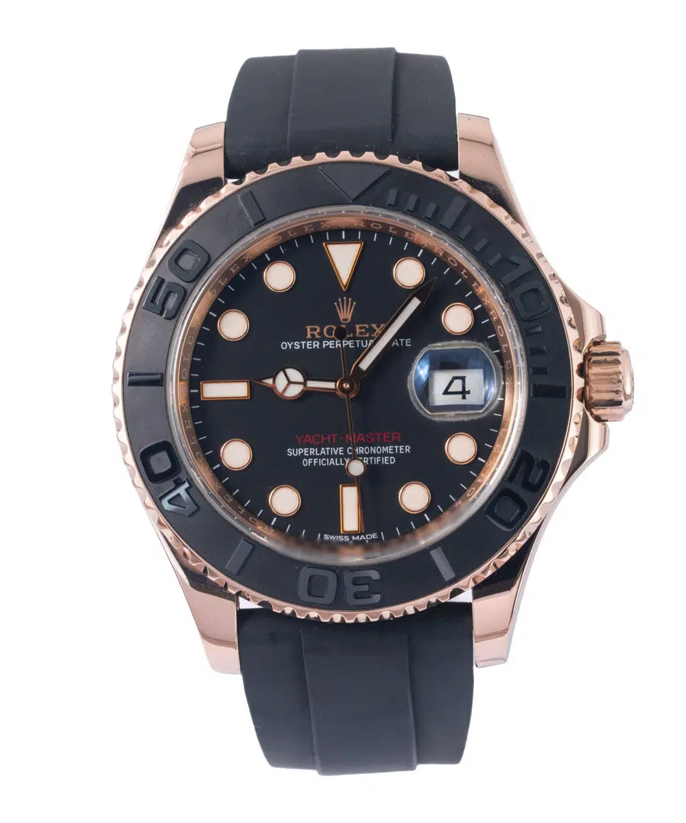 This Rolex Yacht-Master 116655 has a Black dial and a Rubber strap.