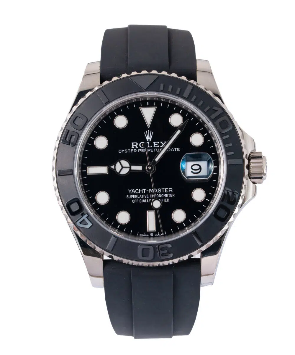 This Rolex Yacht-Master 226659 has a Black dial and a Rubber strap.