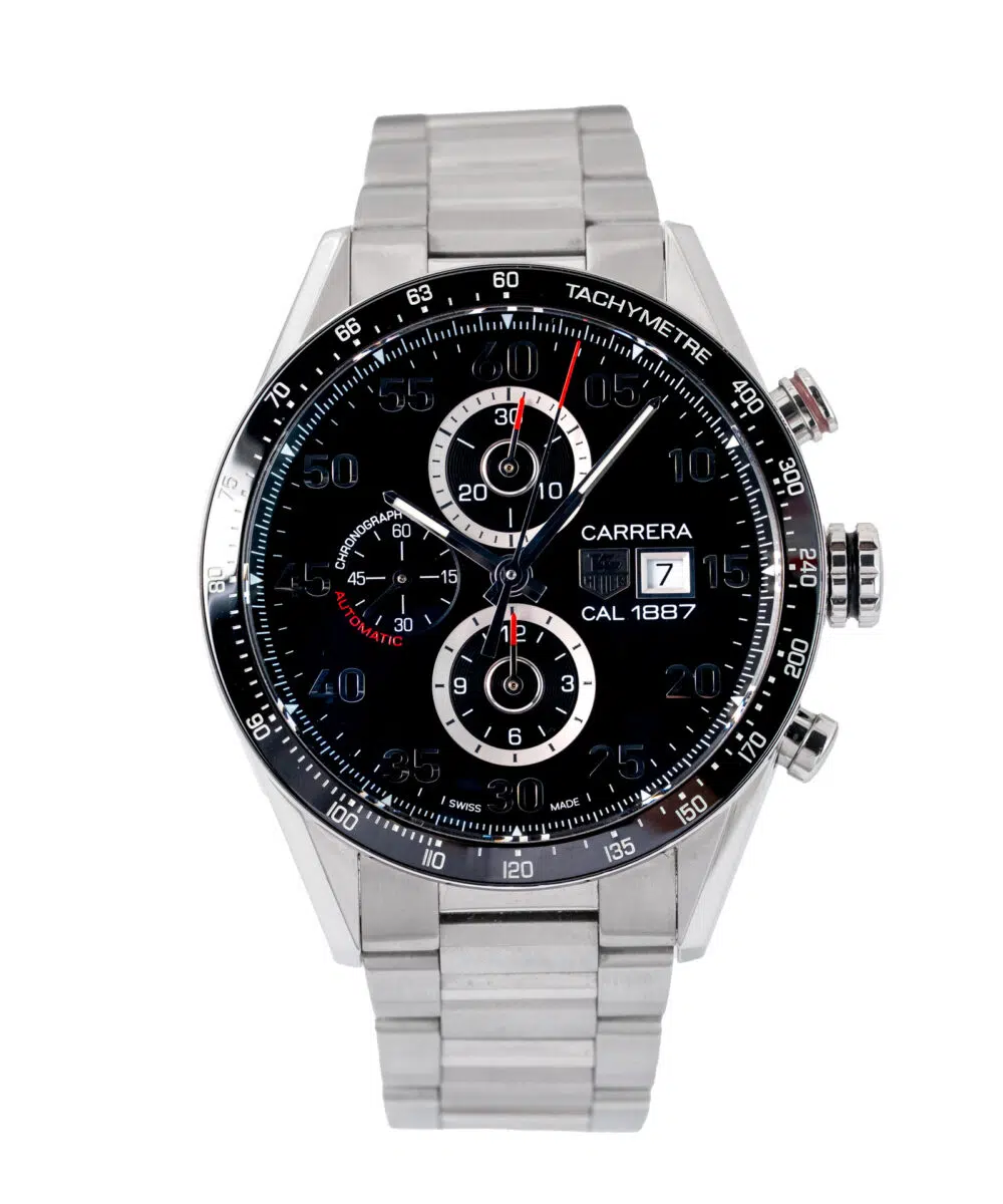 This Tag Heuer Carrera Calibre 1887 CAR2A10-2 has a Black dial and a Bracelet strap.