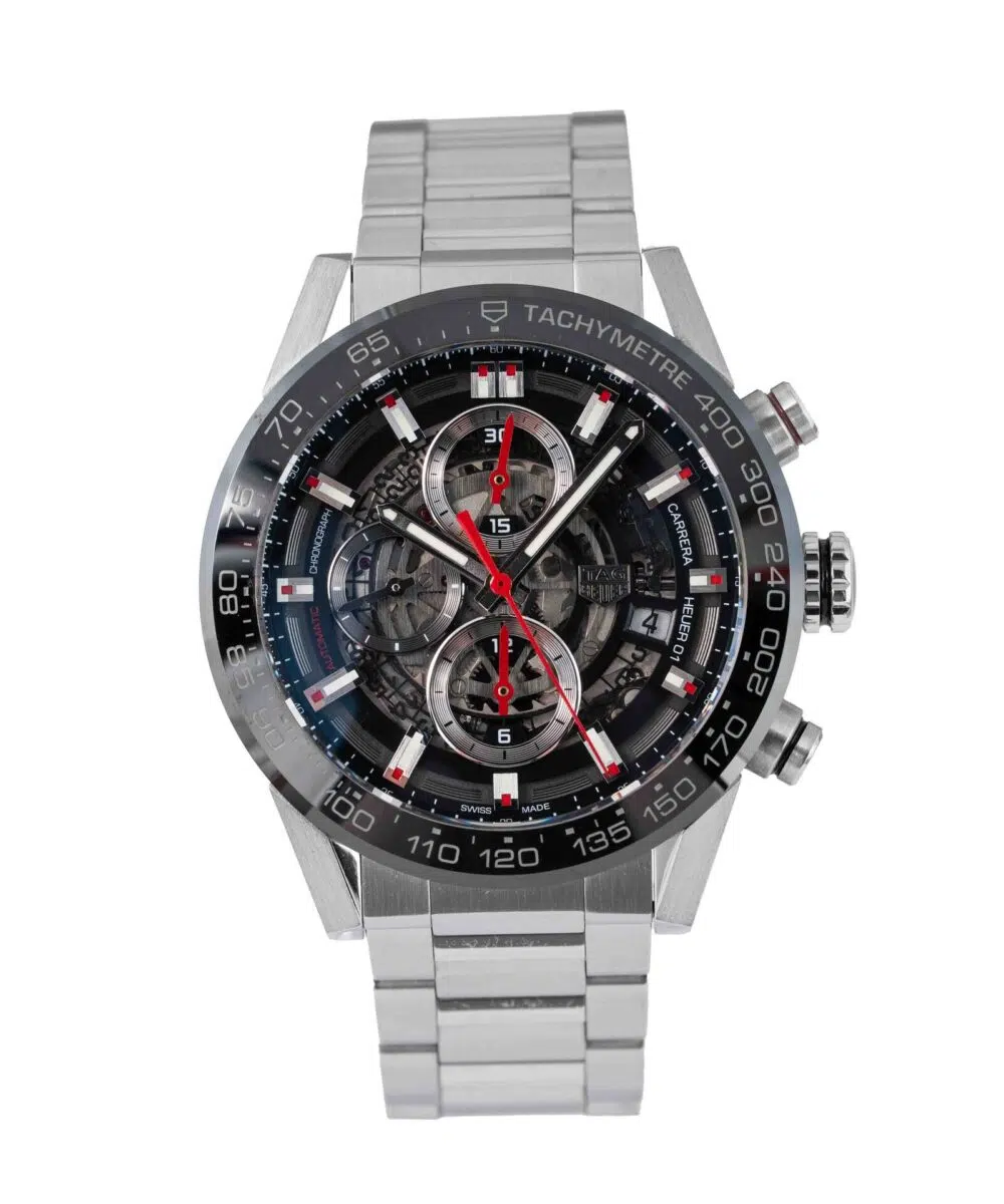 This Tag Heuer Carrera Calibre Heuer 01 CAR201V has a Skeleton dial and a Bracelet strap.