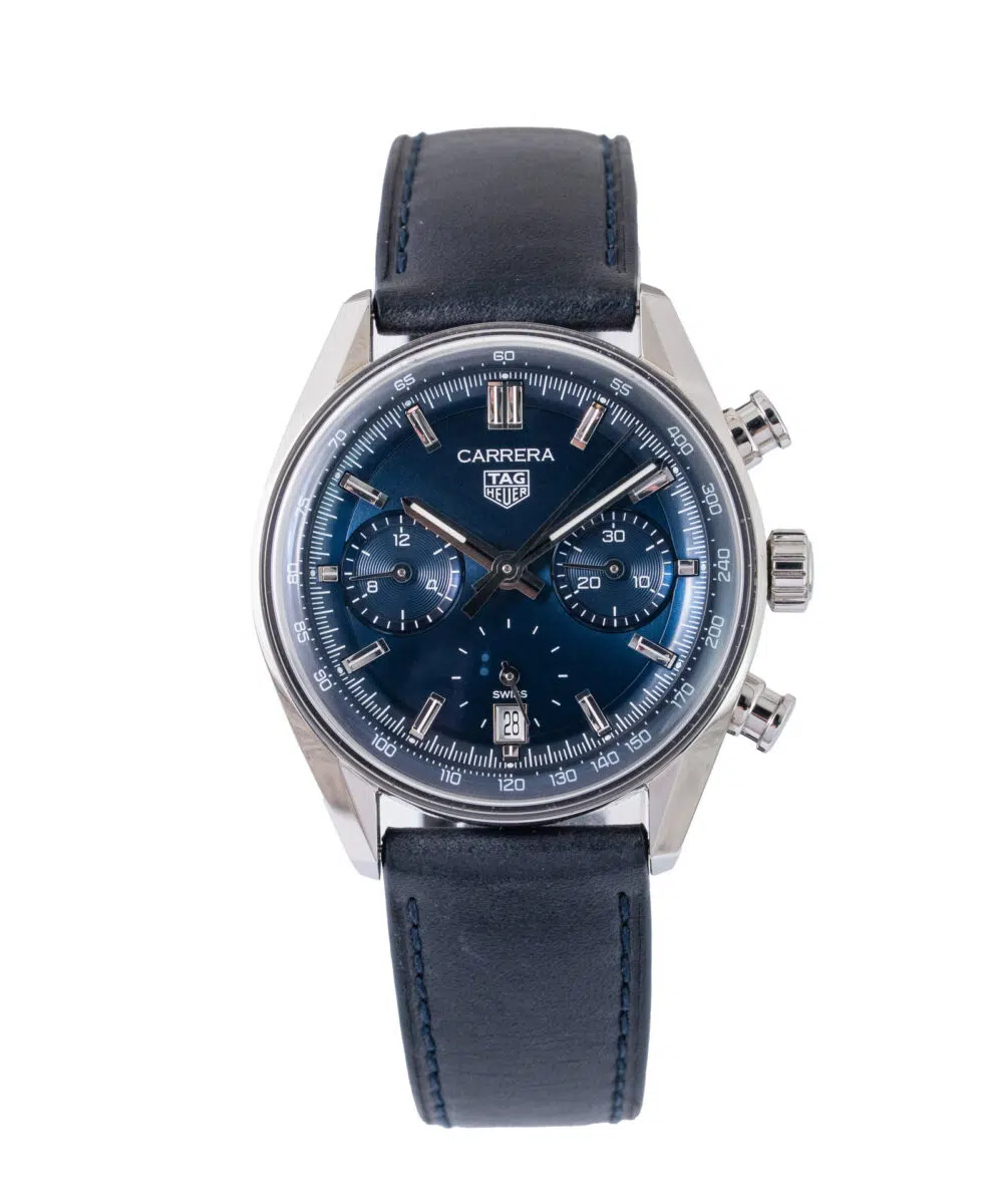 This Tag Heuer Carrera CBS2212-0 has a Blue dial and a Leather strap.