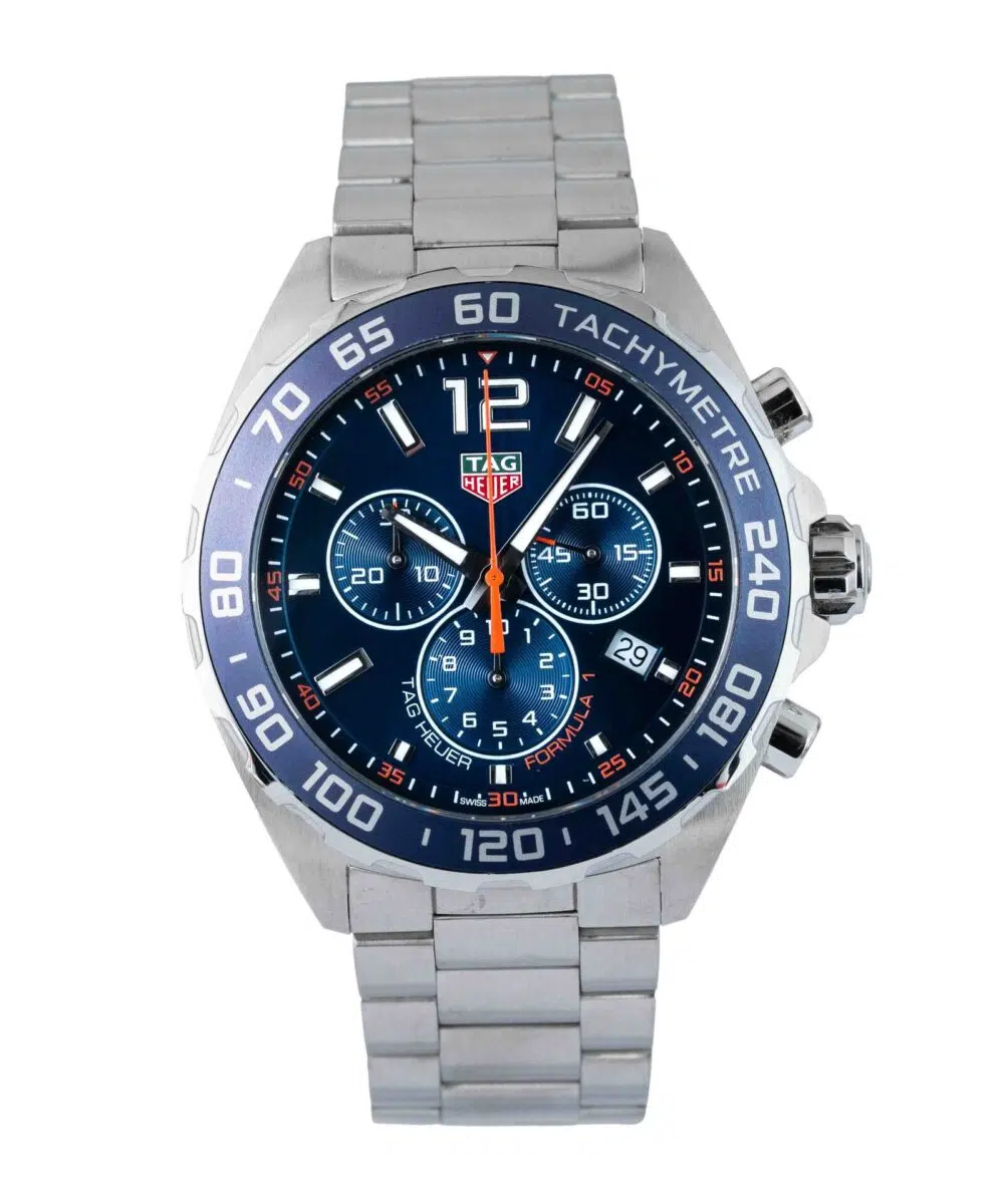 This Tag Heuer Tag Heuer Formula 1 Chronograph CAZ1014 has a Blue dial and a Bracelet strap.