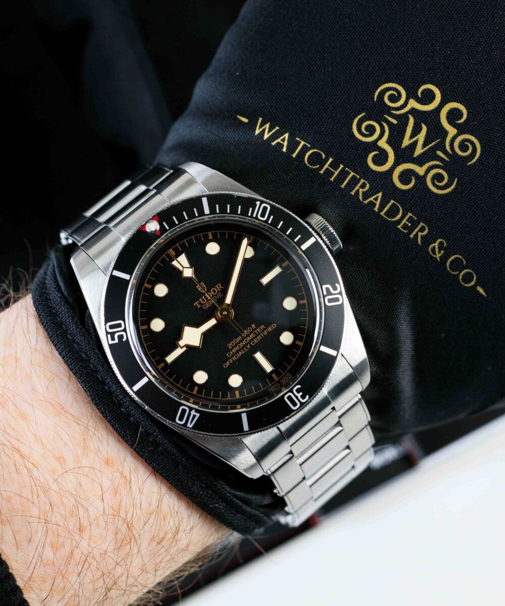This Tudor Black Bay 41 79230N has a Black dial and a Bracelet strap.