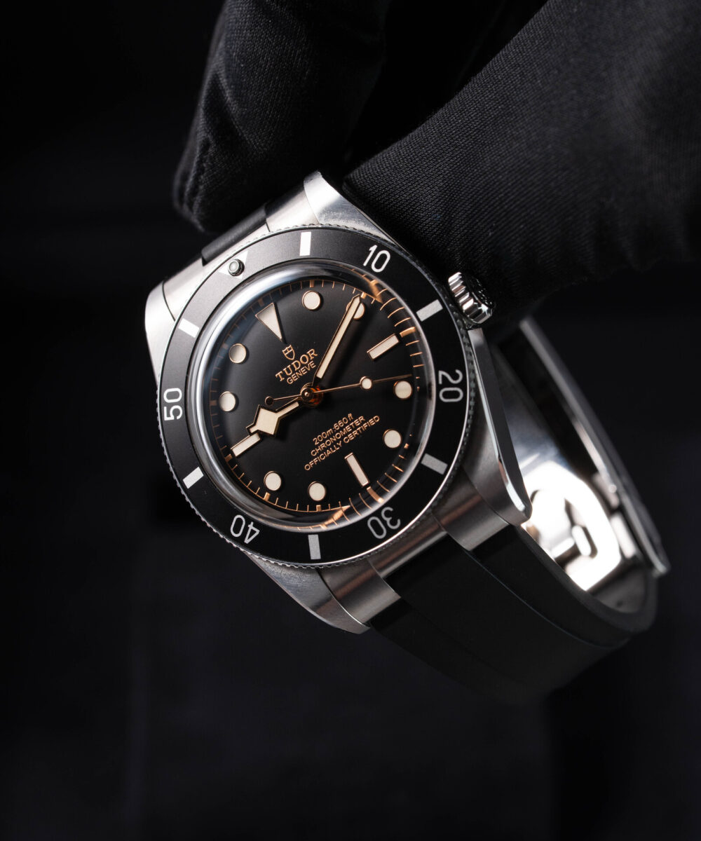 This Tudor Black Bay 54 79000N has a Black dial and a Rubber strap.