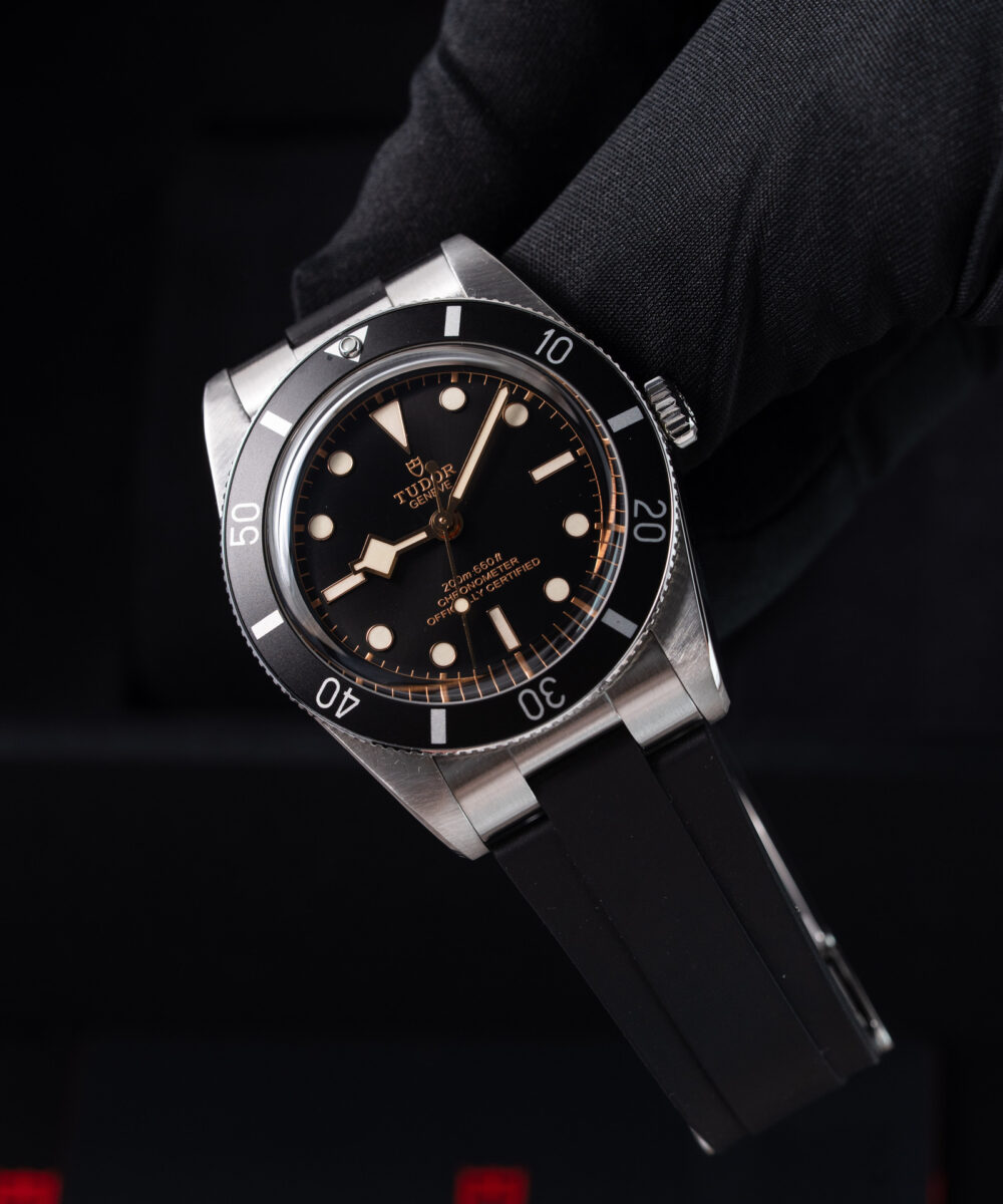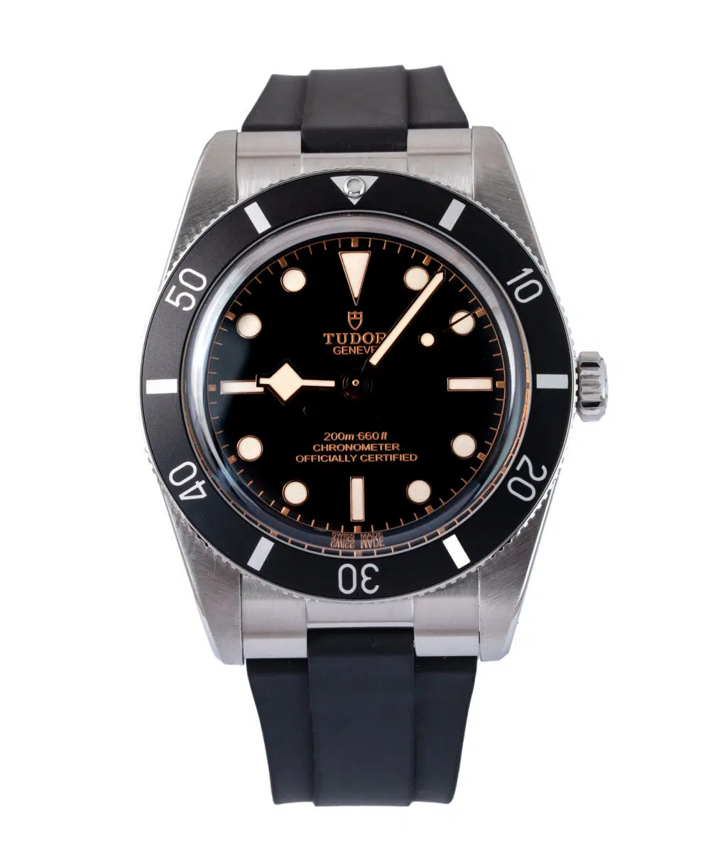 This Tudor Black Bay 54 79000N has a Black dial and a Rubber strap.