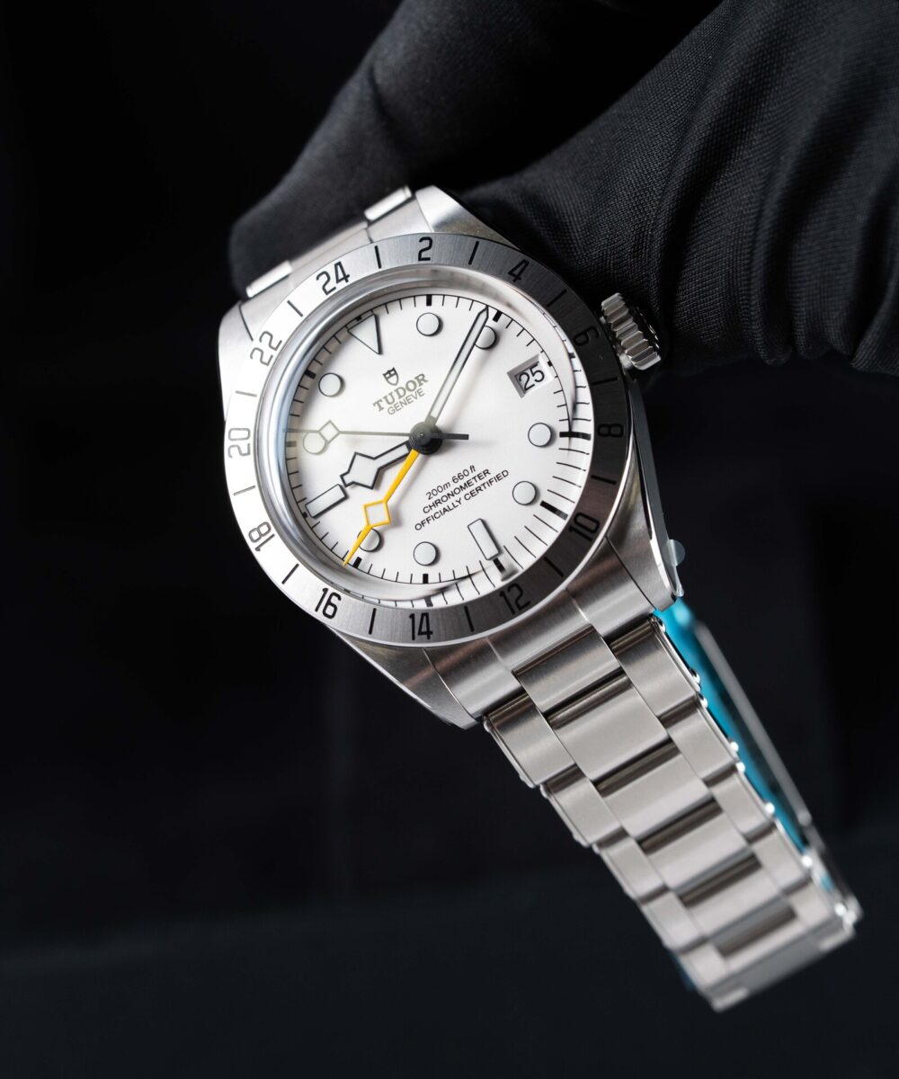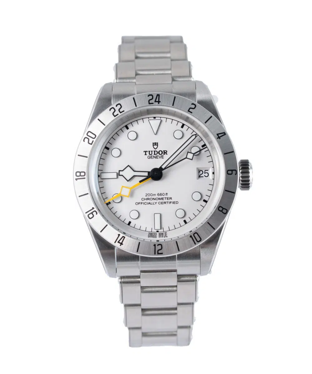 This Tudor Black Bay 79470 has a White dial and a Oyster strap.