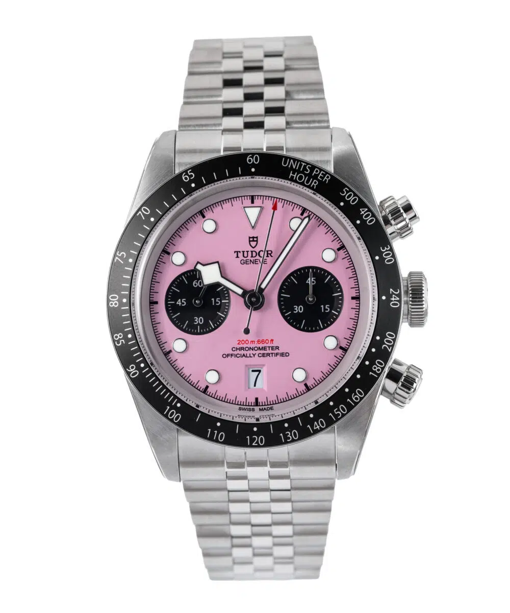 This Tudor Black Bay Chrono 79360N has a Pink dial and a Bracelet strap.