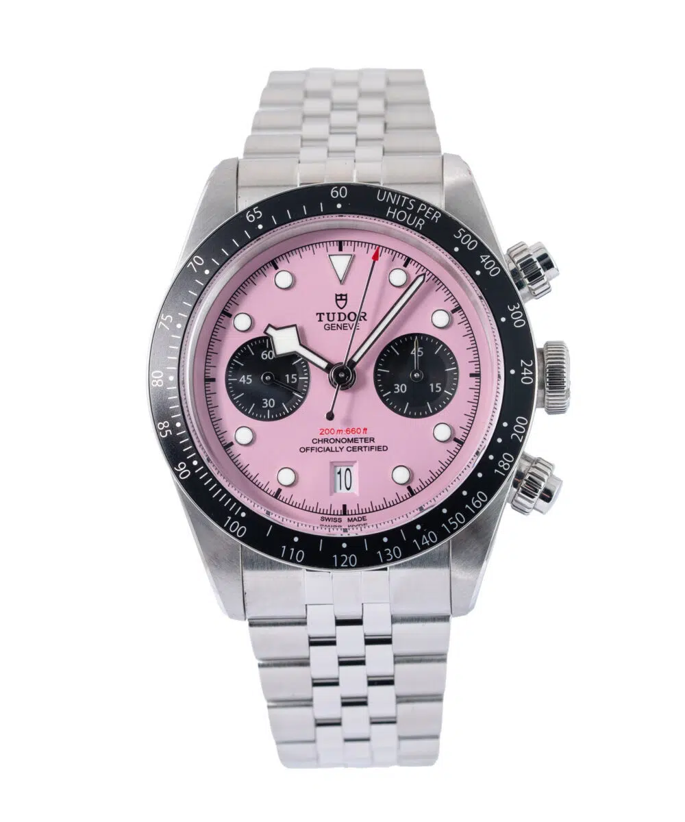 This Tudor Black Bay Chrono 79360N has a Pink dial and a Bracelet strap.