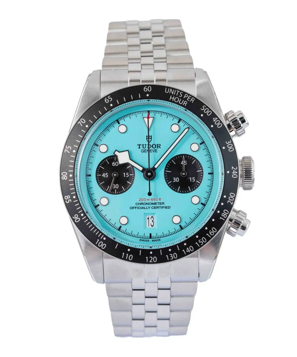 This Tudor Black Bay Chrono 79360N has a Blue dial and a Bracelet strap.