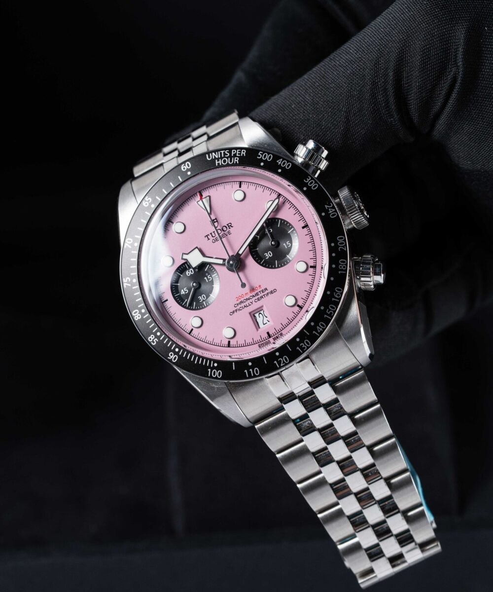This Tudor Black Bay Chrono 79360N has a Pink dial and a Bracelet strap.