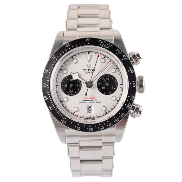 This Tudor Black Bay Chronograph 79360N has a White dial and a Bracelet strap.